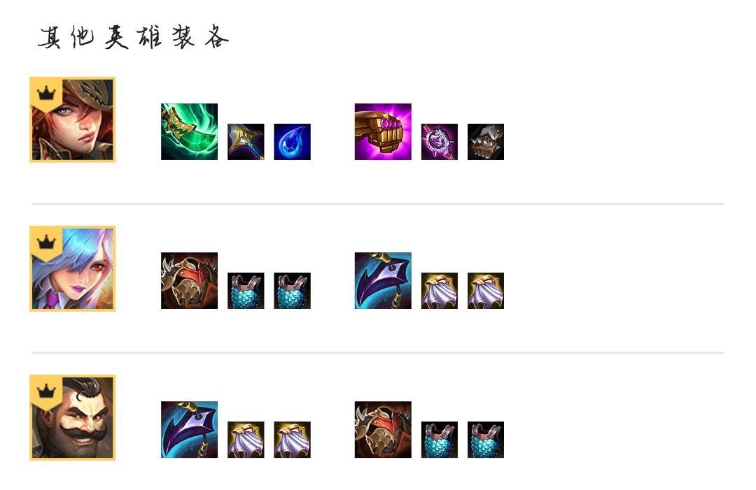 4.其他玩家装备:赏金猎人-厄运小姐:朔极之手,珠光护手;曙光女神-蕾欧娜:棘刺背心,龙爪;弗雷尔卓德之心-布隆:龙爪,棘刺背心。
