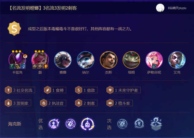 1.阵容组合:由卡兹克、蔚、赛娜、纳尔、杰斯、塔姆、萨勒芬妮、艾克组成八人口阵容,羁绊有3社交名流、1食神、1宿敌、1未来守护者、3发明家、2执法官、2刺客、2格斗家。