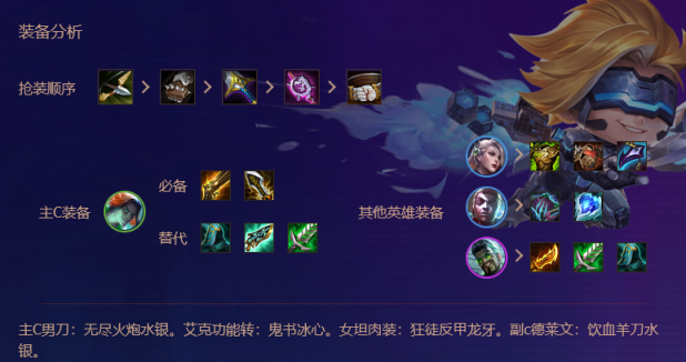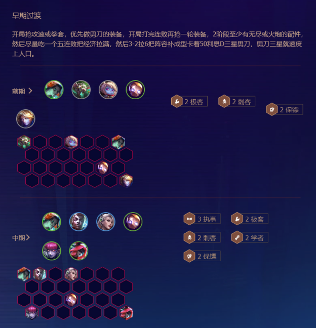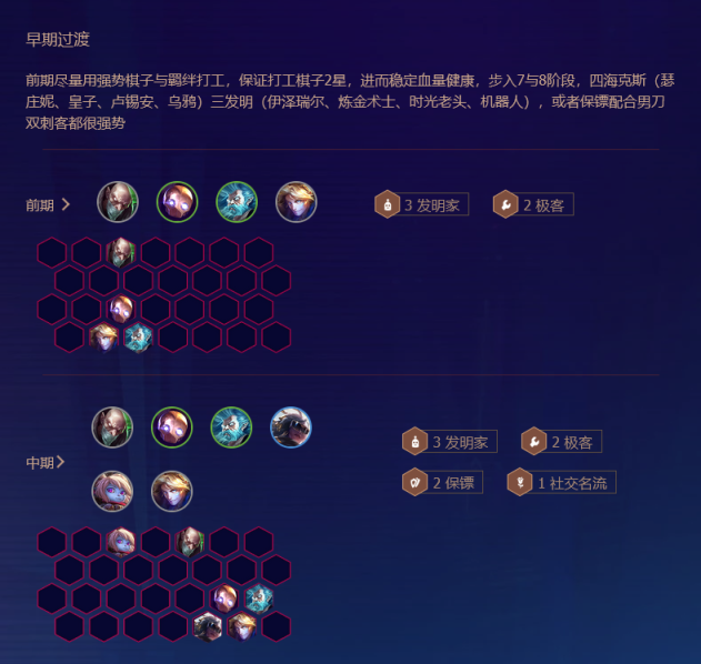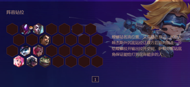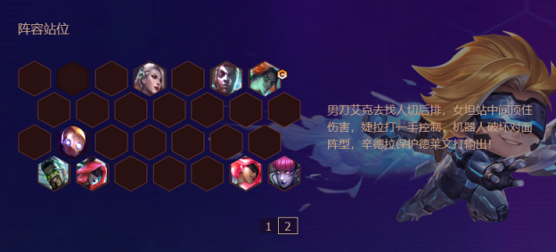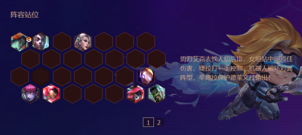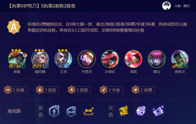 1.阵容组合:由泰隆、雷欧娜、艾克、布里茨、辛德拉、泽丽、婕拉、德莱文组成5执事、2极客、2刺客、2学者、2保镖阵容。