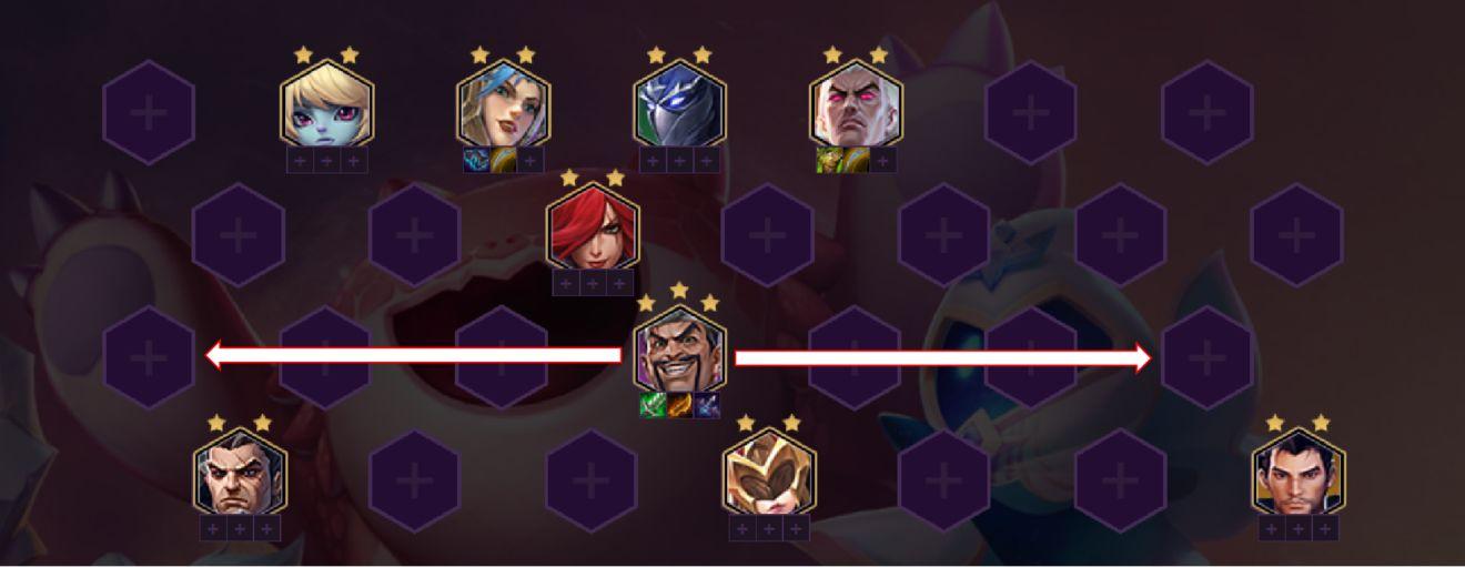 肉顶前,两张卡拉底角防机器人勾,帝国之斧站第三排保证第一时间输出,根据敌方站位可左右灵活调动(注意亚索周围不要站人保证刷出浪人护盾)