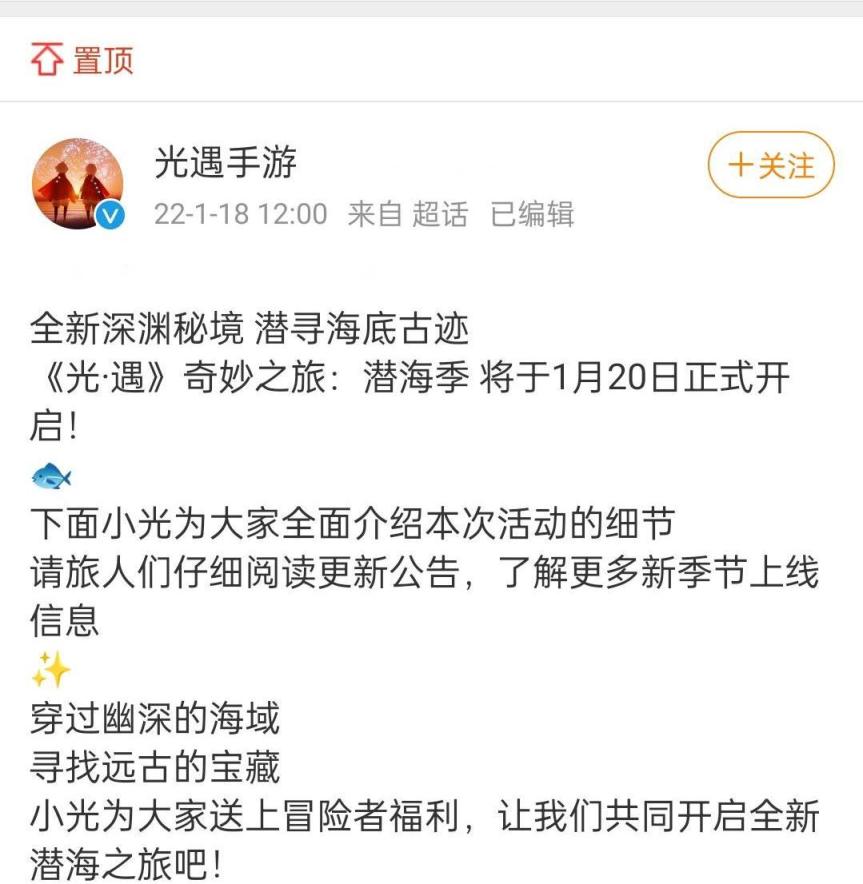 光遇国服新季节为潜海季,官方发布具体时间为2022年1月20日开始,穿过深渊的海域,潜寻海底古迹,获取深海宝藏。根据测试服来看,深渊季的活动位置应该是在墓土地图中,因为是和海洋因素有关系,所以可能兑换的装扮也会带来海洋元素,会有一个新奇的体验。