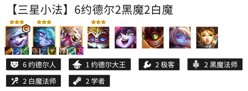 金铲铲之战s6约德尔人推荐玩【三星小法】6约德尔2黑魔2白魔,具体攻略如下: