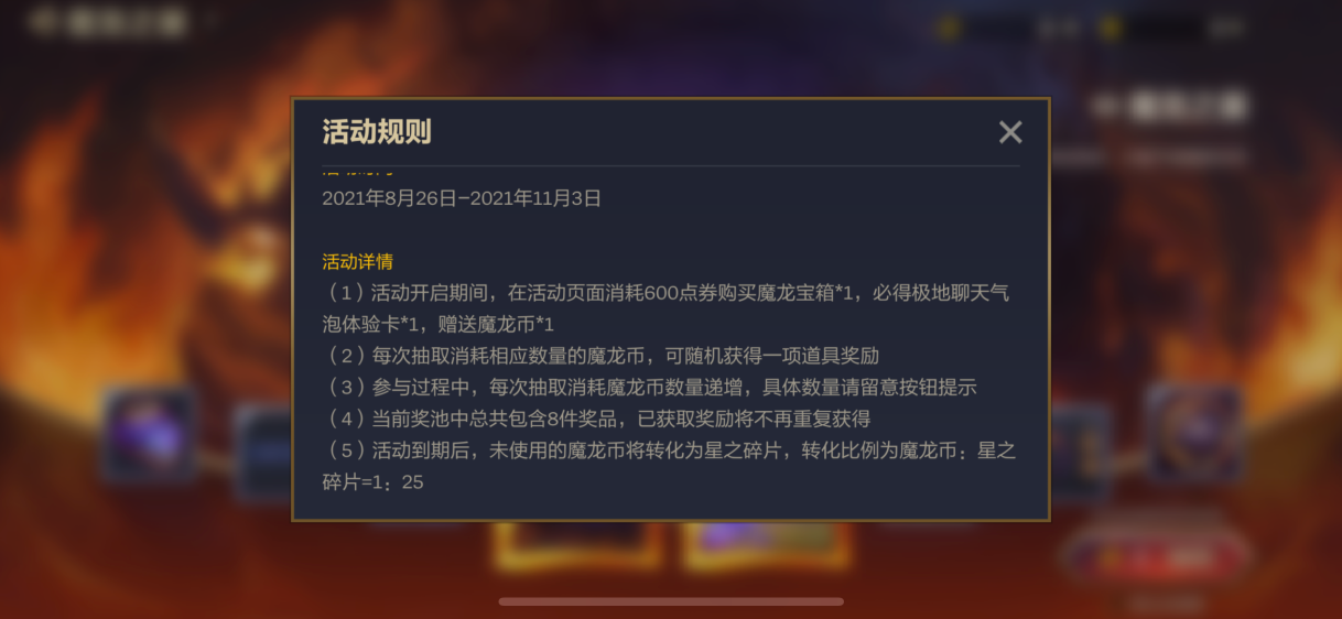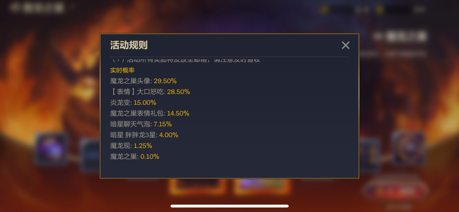2.再看奖品的中奖概率,这里只用关心魔龙之巢棋盘皮肤,概率是0.1%,其他皮肤中奖概率至少是魔龙之巢的10倍起。你可以认为不管轮到第几抽,很大概率都不会是魔龙之巢,几乎得到第8 抽才能获得。也就是说,几乎得花1050元。