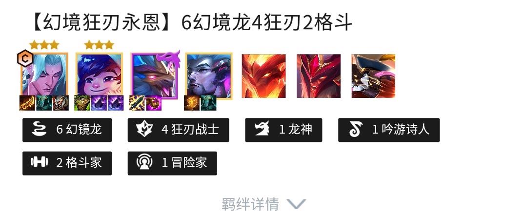 2.因此由幻镜龙-决斗大师的效果的玩法目前只有一种就是幻镜狂刃永恩。阵容推荐:以永恩为主C,前排为努努,再加上迭嘉,亚索,慎,奥拉夫和巴德七人组成。