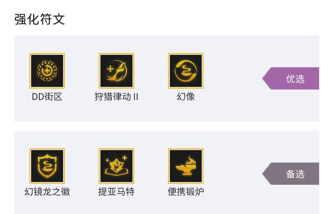 3.强化符文:优选DD街区,狩猎律动和幻象。其次可以选择幻镜龙之徽,提亚马特和便携锻炉。