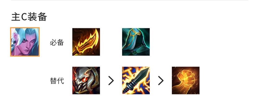 4.主C装备:永恩别被装备为鬼刀和水银,第三件装备最好为泰坦的坚决,其次可以装备电刀和正义之手。
