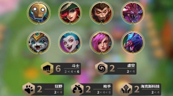 1.首先阵容羁绊组成:6斗士,2虚空,2狂野,2抢手,2海克斯科技。
