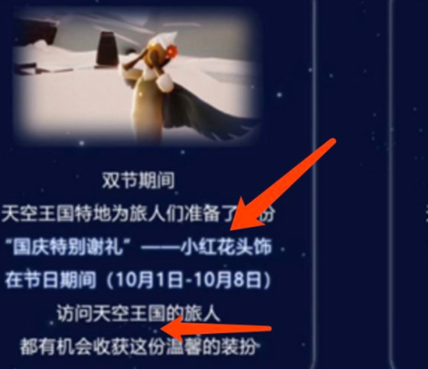 2.双节期间,天空王国特地为旅人们准备了一份国庆特别谢礼小红花头饰,在节日期间10月1日,10月8日访问天空王国的旅人都有机会收获这份温馨的装扮。