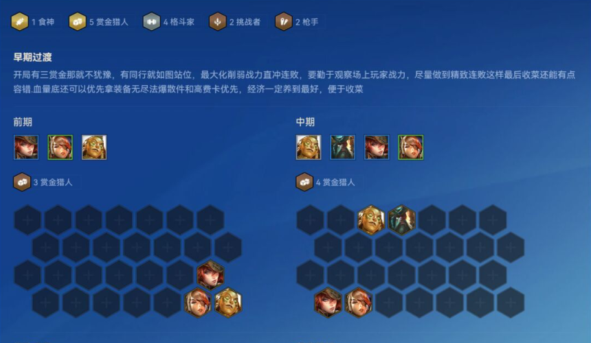 1、玩家玩赏金猎人连败的话,最好是能拿到有赏金猎人转职的海克斯,尽量早点凑到3赏金或者5赏金,用赏金猎人加别的棋子尽量使自己连败。