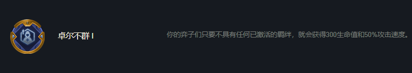 卓尔不群有1级,2级,3级,这个羁绊在前期第一个选到的话,前期战力将会大大提升,是一个不错的海克斯。