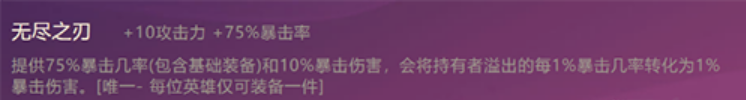 2、提供75%暴击几率(包含基础装备)和10%暴击伤害,会将持有者溢出的每1%暴击几率转化为1%暴击伤害。
