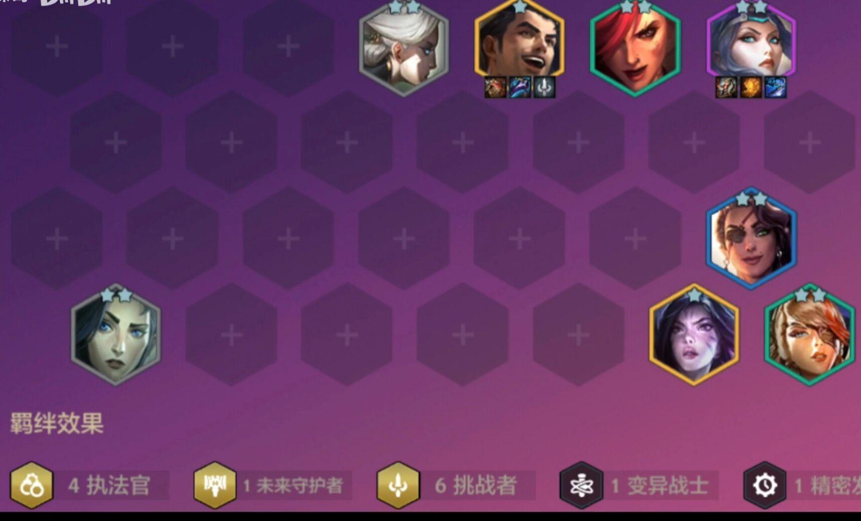 1、阵容:4执法官、4挑战者、2精密发条、2狙神、1未来守护者;如果拿到执法官转植可以给永恩,永恩替换凯特琳,奎因替换烬,凑齐6挑战者,或者挑战者转植给杰斯,奎因换烬。