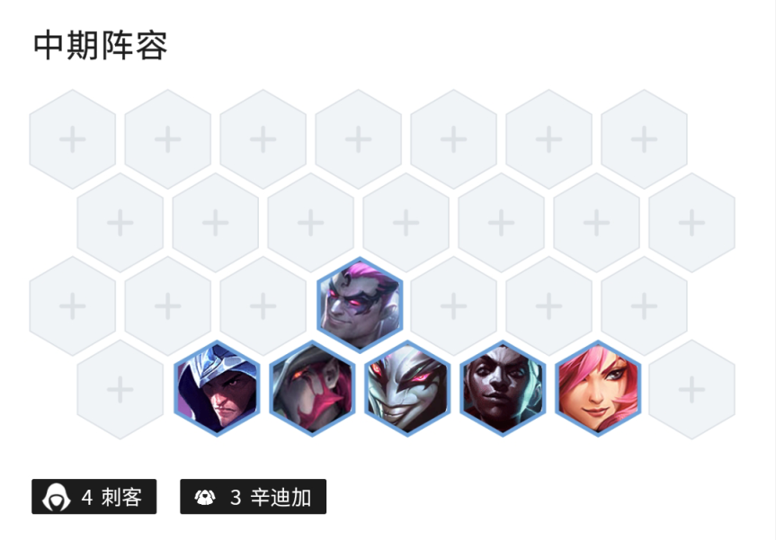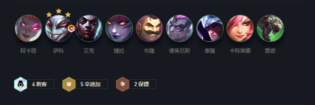 2、羁绊组成:6刺客、5辛迪加、2保镖。