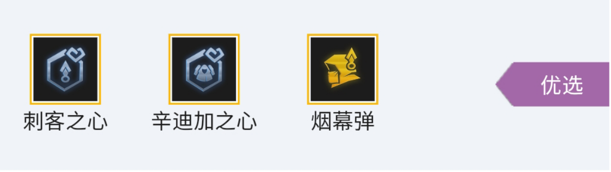 1、优选:刺客之心、辛迪加之心、烟幕弹。