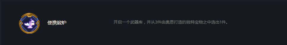 1、金铲铲之战海克斯科技中,有一个海克斯名为“便携锻炉”,选择该海克斯后可以开启一个武器库,并从3件由奥恩打造的独特宝物之中选出1件。