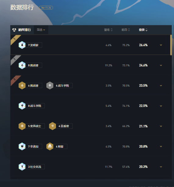 3、之后还有类似8挑战等阵容也是比较强力的, 其实游戏中没有最强的阵容,都要看海克斯以及装备。最合适的才是最厉害的。查看官网排行榜就可以知道,在合适的情况下很多阵容都可以脱颖而出。