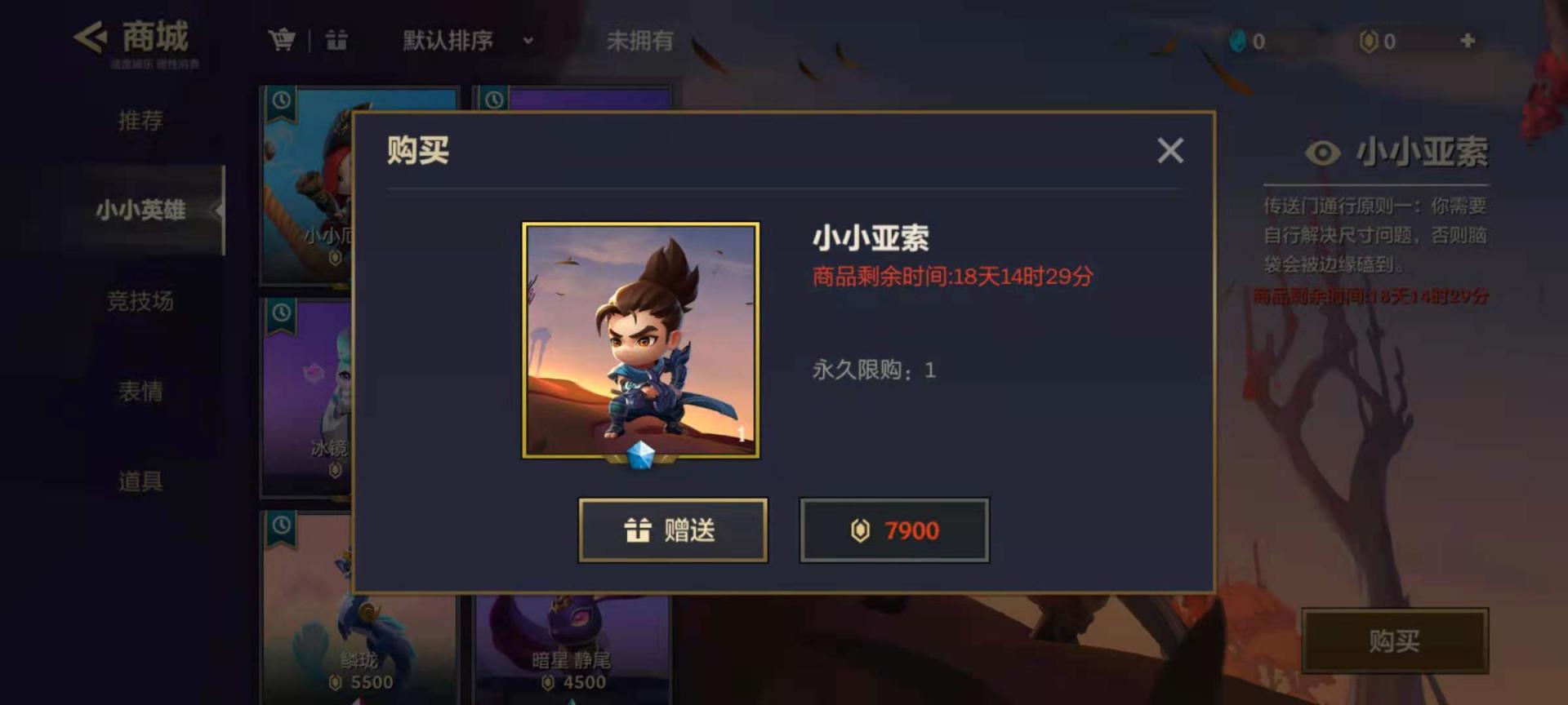 1.想要获得至臻小小亚索,必须先拥有小小亚索英雄,目前售价7900精华,也就是79元。