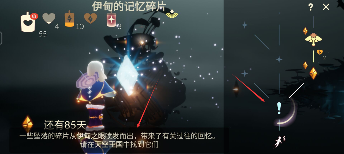 4、回到遇境,通过了解任务我们了解到需要找到红石刷新点来完成任。红石刷新地图可以通过门上方的红色石头查看,有红色石头的表示:红石正在陨落。