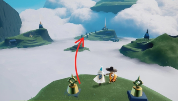 2、在草地上找到挥手先祖,点燃后跟着他走到塔上重温回忆。