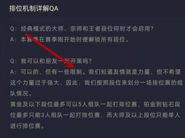 2、其次黄金及以下段位可5人组队打排位,铂金到钻石段位可3人组队,大师以上段位只能单人比赛不能组队。