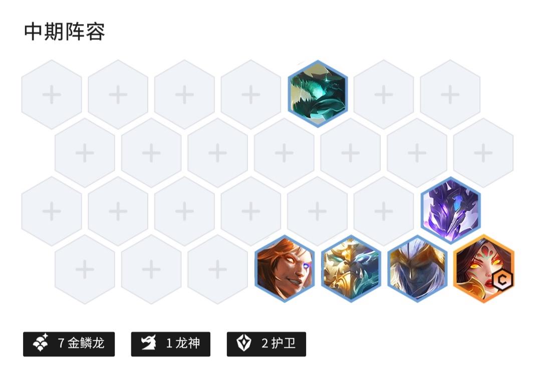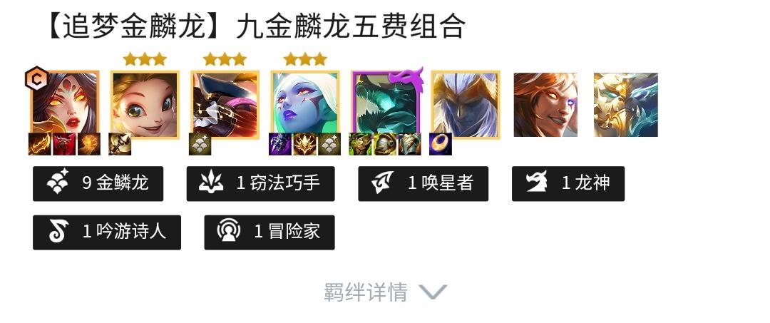7.中后期运营:3-2上六人口,有三金鳞龙就不用D,没有的话可以尝试D一波,4-1左右上七人口,七人口不用D,我们需要四费卡,所以需要在4-5上八人口后,将霞和艾达丝D到两星,来佐伊就直接将金鳞龙羁绊拉满。注意需要将钱卡到80,毕竟金鳞龙的装备很多都是80利息收益最大化。