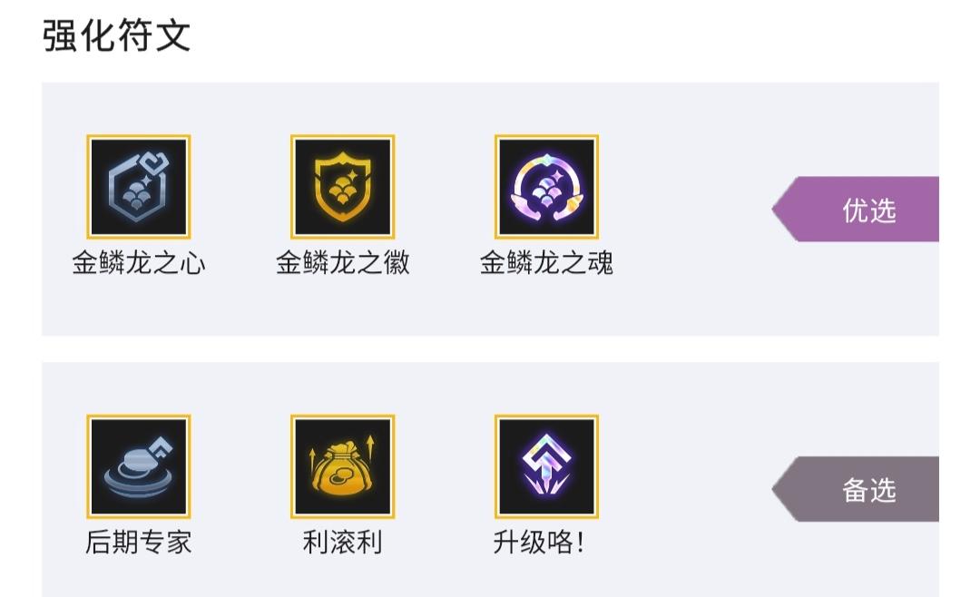 2.强化符文:优选最好是关于金鳞龙转职相关的强化符文。其次可以选择后期专家,利滚利和升级咯等经济类型的强化符文。