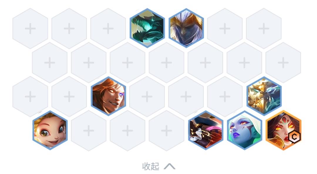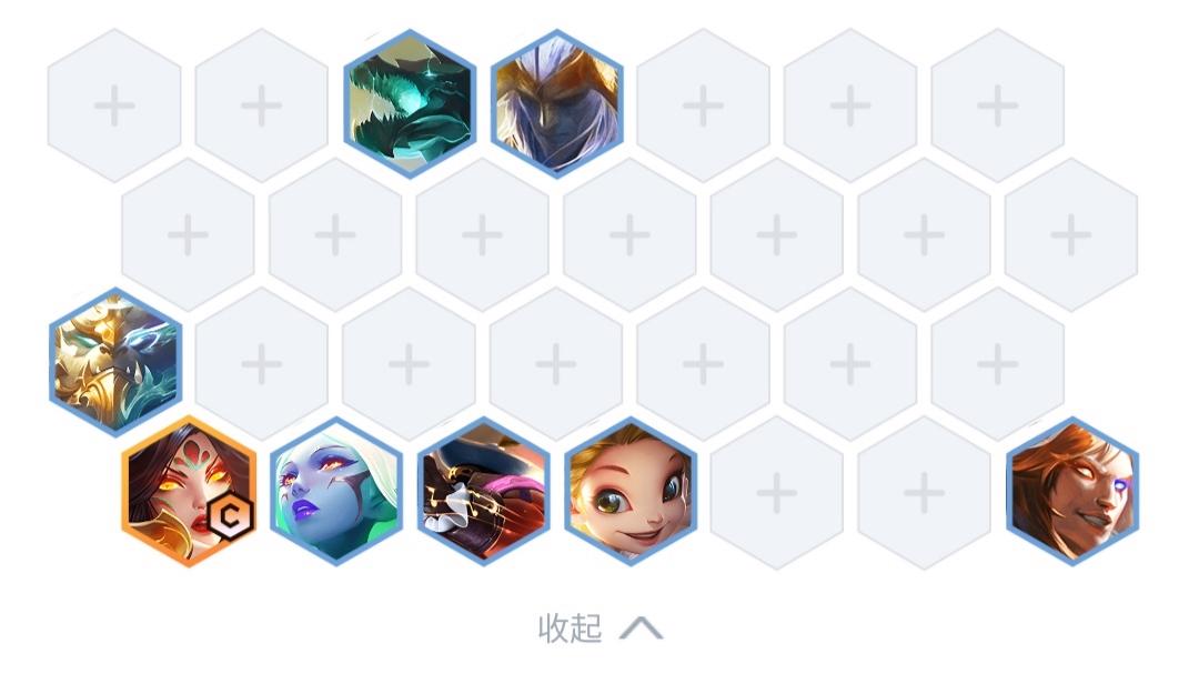 9.阵容站位一:艾达丝纯肉装在前排抗伤,有坚定投资器一般让剑魔上去送,有伏击就让霞站在角落,没有伏击的话就看锤石的位置,没有锤石站角落。其他弈子都主要是以保护霞打钱为主,如果开出了九金鳞龙,群英冠冕就给奶妈或者巴德。