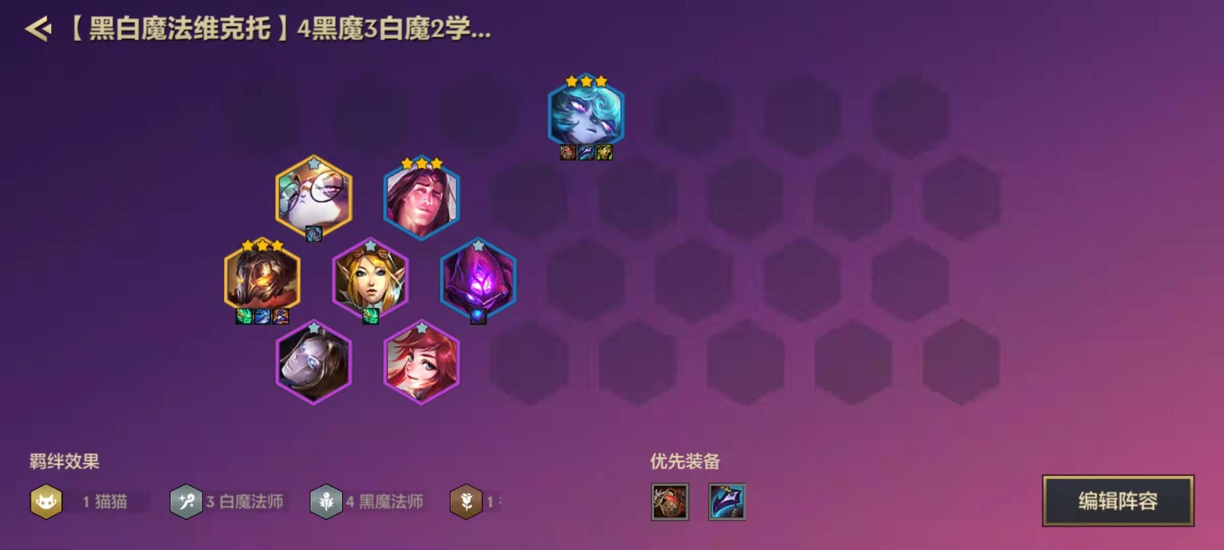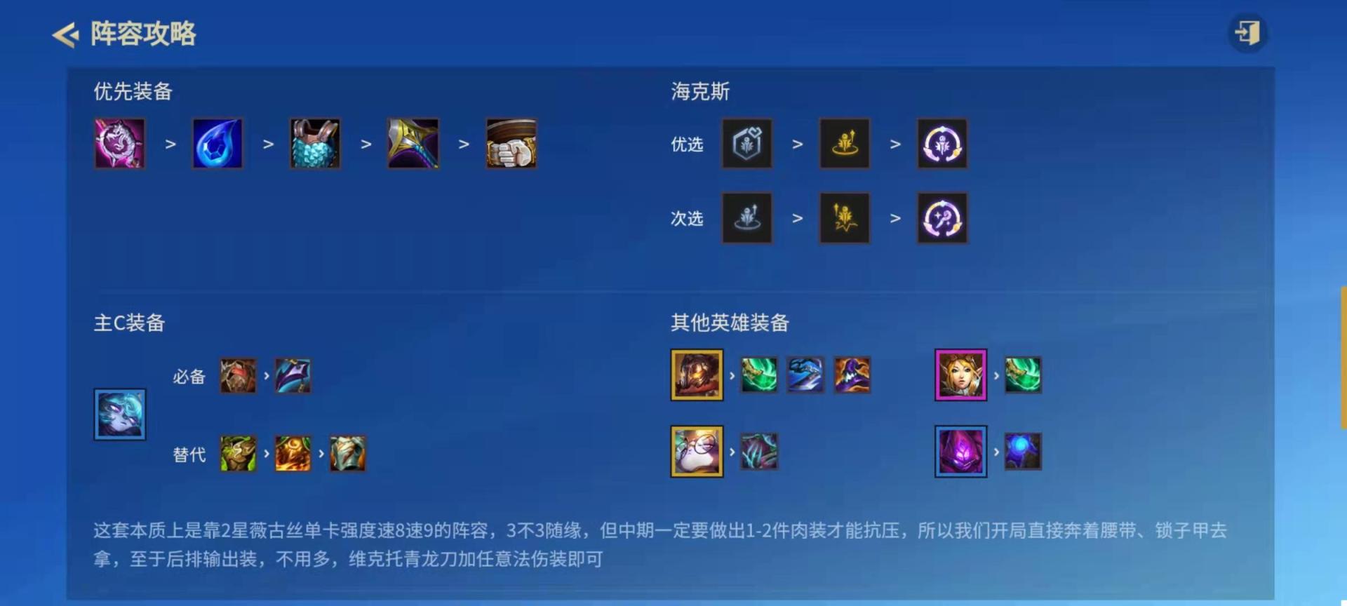 2、铲铲之战S6维克托主C阵容装备分配:维克托作为阵容的核心优先选择青龙刀、法帽、巨杀