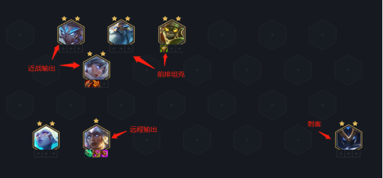(1)所以当你摆放后排棋子时,要尽量保证避开刺客保证输出。如果有遇到潜行者站位是全在一排这种情况时,我们也可以把后排输出棋子放在前排,以此来避开敌方潜行者切我方的输出。