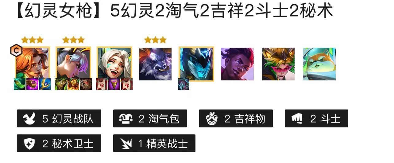 在金铲铲之战S8赛季中,幻灵战队有两种玩法,第一种玩法阵容是由女枪、锐雯、金克丝、牛头、瑟庄妮、艾克、薇恩、狗头组成,羁绊是由5幻灵战队、2淘气包、2吉祥物、2斗士、2秘术卫士、1精英战士组成。