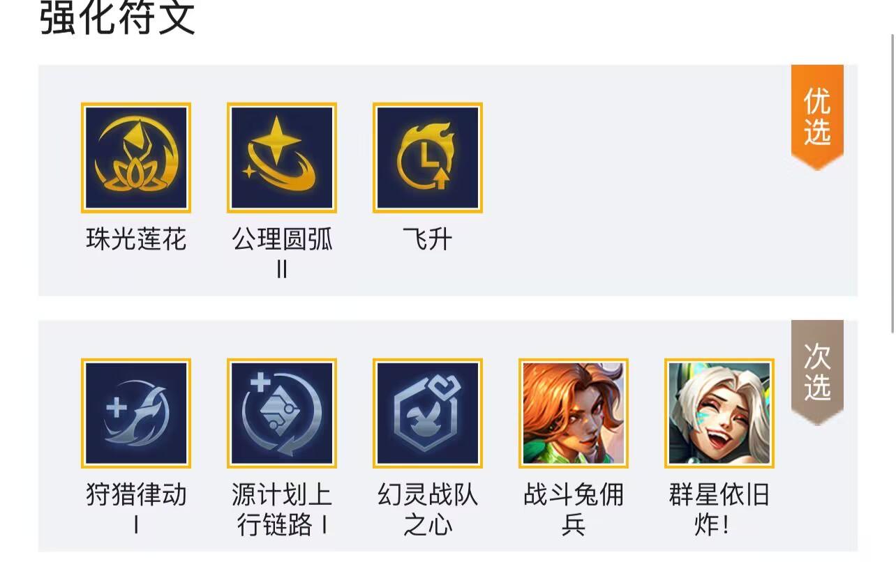 强化符文优选珠光莲花、公理圆弧2、飞升,次选狩猎律动1、源计划上行链路1、幻灵战队之心、战斗兔佣兵、群星依旧炸。