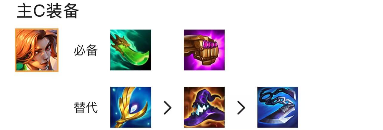主C女枪必备装备是朔极之矛、法爆,替代装备是大天使纸张、帽子、巨杀。