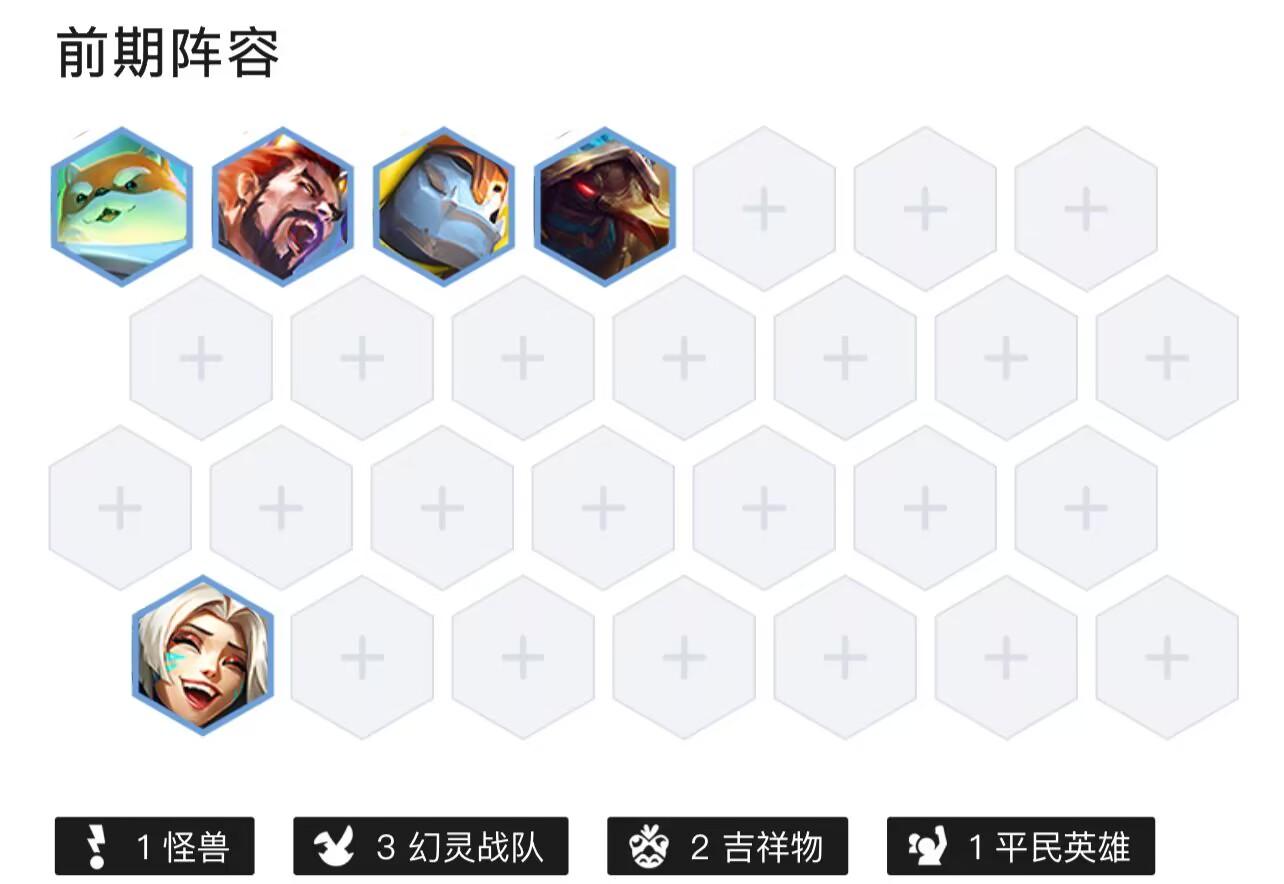 前期阵容:狗头、塞拉斯、加里奥、拉莫斯在第一排抗伤,金克斯在最后一排输出,羁绊是由1怪兽、3幻灵战队、2吉祥物、1平民英雄组成。