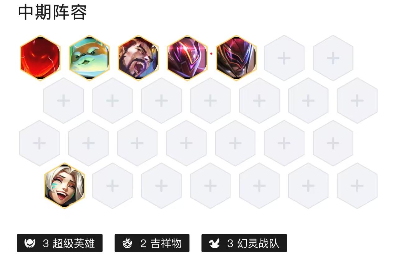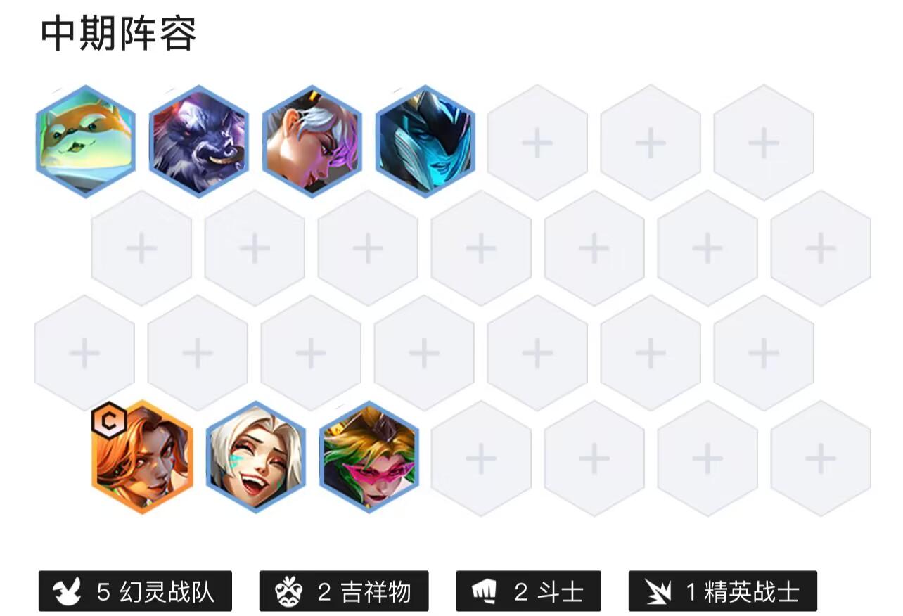 中期阵容:狗头、牛头、锐雯、瑟庄妮在第一排抗伤,女枪、金克丝、薇恩在最后一排输出,羁绊是由5幻灵战队、2吉祥物、2斗士、1精英战士组成。