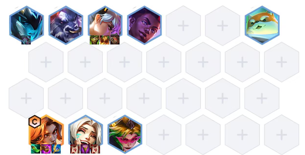 后期阵容:瑟庄妮、牛头、锐雯、艾克、狗头在第一排抗伤,女枪、金克丝、薇恩在最后一排输出。