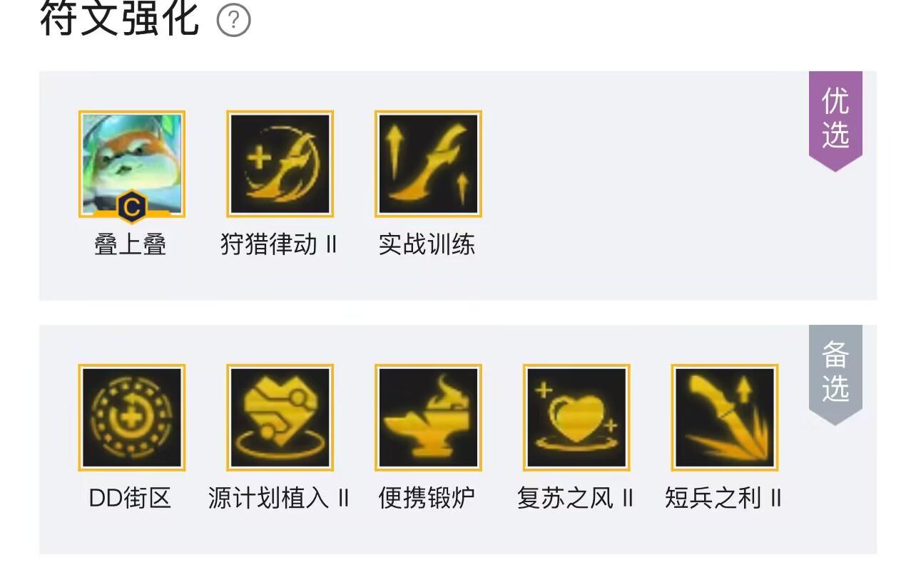 符文强化优选叠上叠、狩猎律动2、实战训练,备选DD街区、源计划植入2、便携锻炉、复苏之风2、短兵之利2。