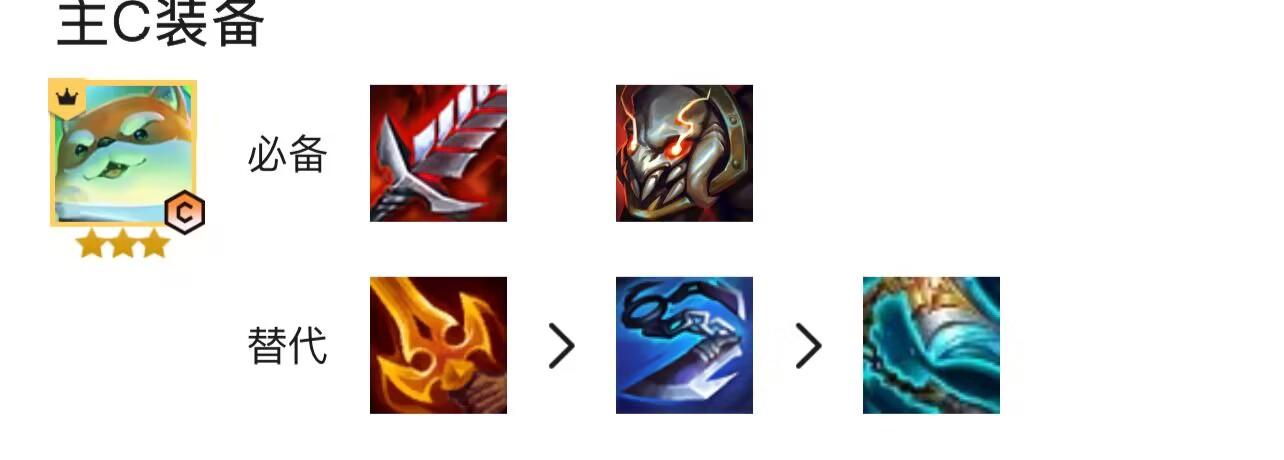 主C狗头的必备装备是饮血剑、泰坦的坚决,替代装备是死亡之刃、巨杀、破防者。
