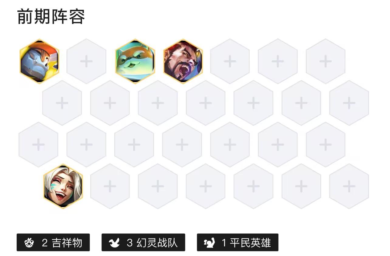 前期阵容:加里奥、狗头、塞拉斯在第一排抗伤,金克丝在最后一排输出,羁绊是由2吉祥物、3幻灵战队、1平民英雄组成。