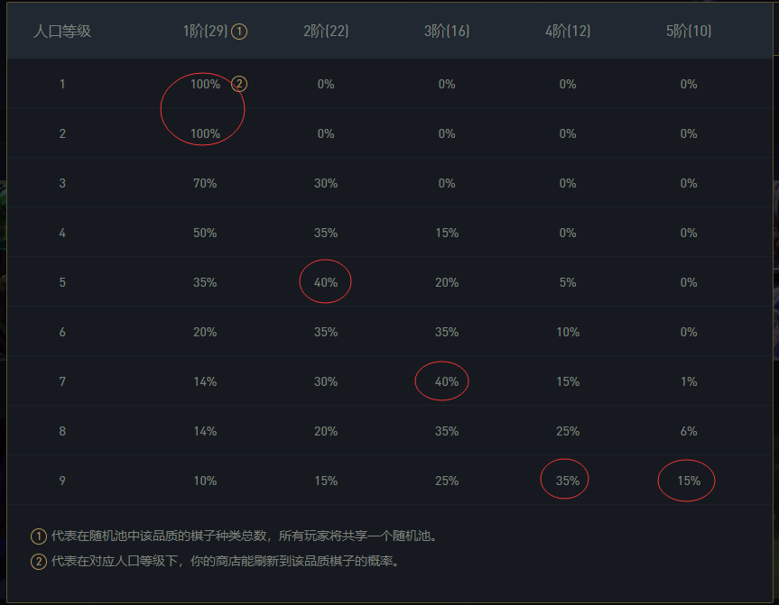 5、在进入游戏之前还应该了解不同人口等级的英雄刷新概率,这样才能明白怎么去提升英雄星级。