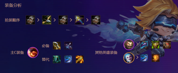 10、主C希维尔需要佩戴起码两件输出装,否则后期输出会比较乏力,最好是无尽 轻语的暴力组合,再加上高强袭羁绊提供的攻击力加成,一波飞轮弹射之后基本都能清掉敌方后排。第三件一般选择水银保证容错,做不出来的话也可以选择汲取剑、正义之手、火炮等常见的AD装补伤害或者续航。其次是T位的坦克装,反甲、龙牙、狂徒都是标配。做完两个核心人员的装备后,其余散件尽量分给极客单位,每人一件去偷就可以了,增加极客提供的护盾值。