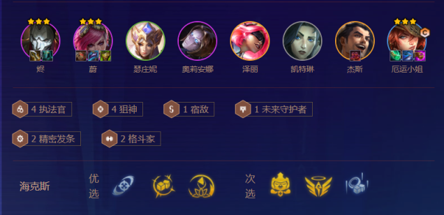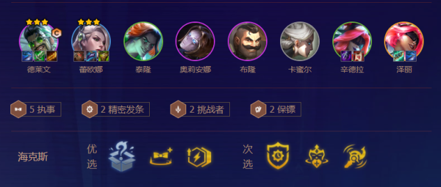 1、4精密3执事2保镖阵容,以德莱文为主C,烬为副C,一般德莱文二星就可以吃分了。
