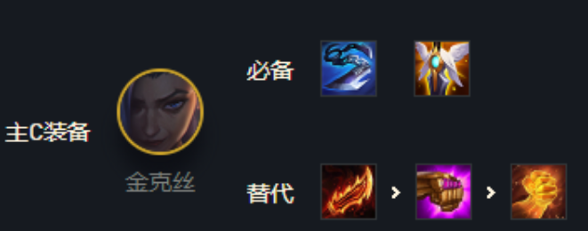 1.主C金克丝:装备给上羊刀,巨杀,复活甲备选法爆,正义