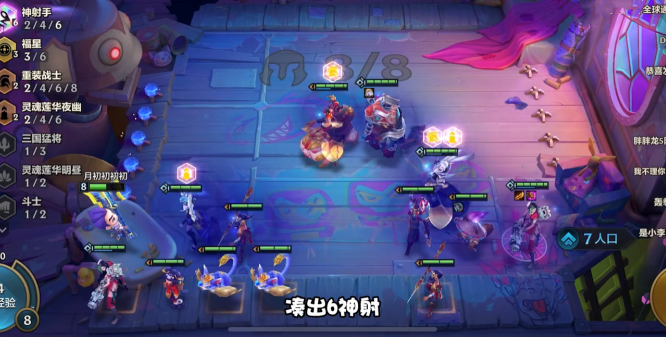6、在4-2时直接D到天选神射金克丝,随后便吃满利息在4-6时拉了八人口,凑出6神射