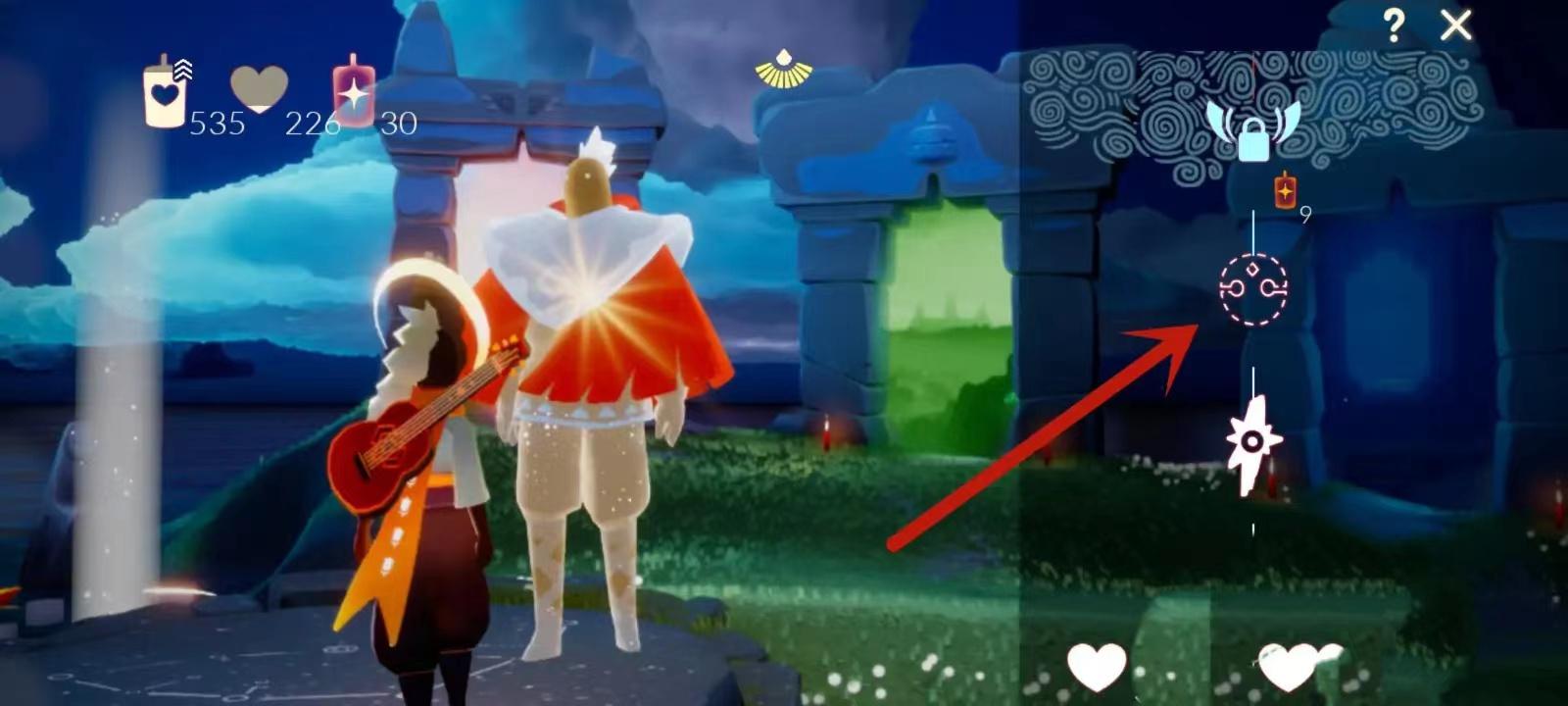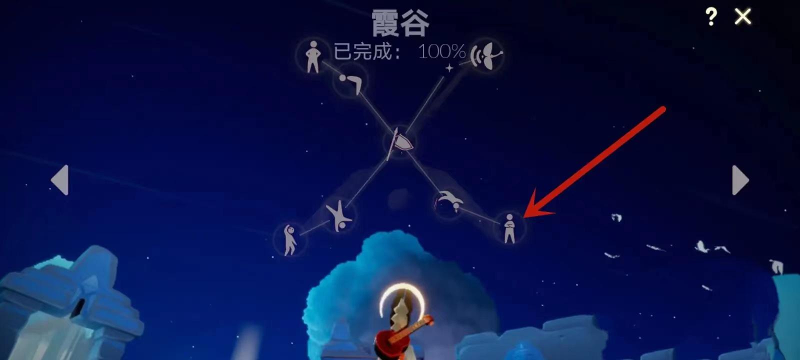 2、玩家首先需要解锁霞谷地图,进入后滑到溜冰场,然后前往不需要解锁的滑行赛道,一直滑行,在右侧的一个台子里有一束光,玩家收集好后,在星盘内滑动找到霞谷里的先祖,点击抱胸姿势先祖