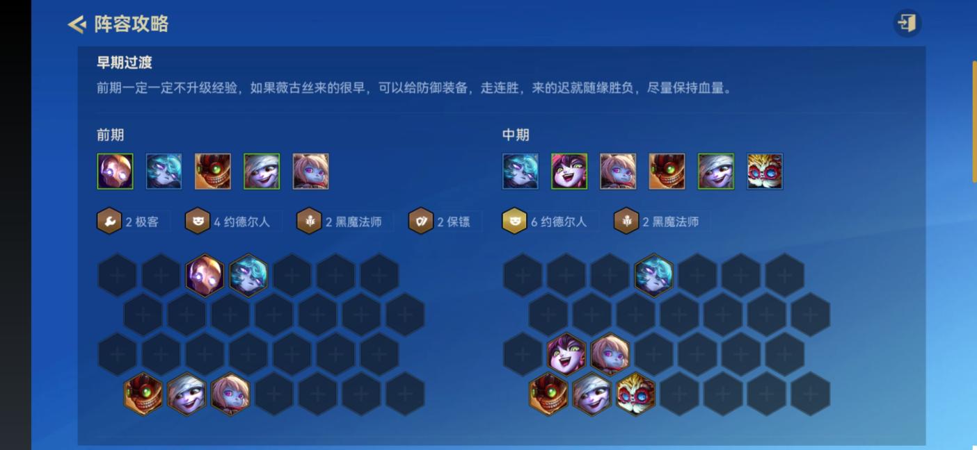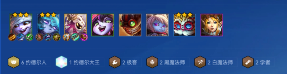 1、阵容组成:六约德尔1约德尔大王2极客2黑魔2白魔2学者。