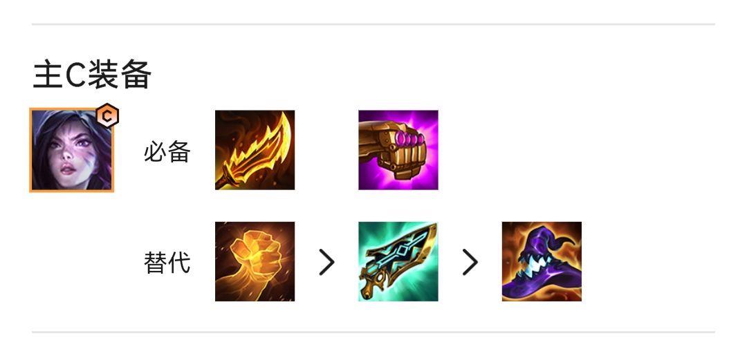 1.卡莎主C,装备:鬼索的狂暴之刃,珠光护手,第三件正义之手或者海克斯科技枪刃或者班克斯的魔法帽。