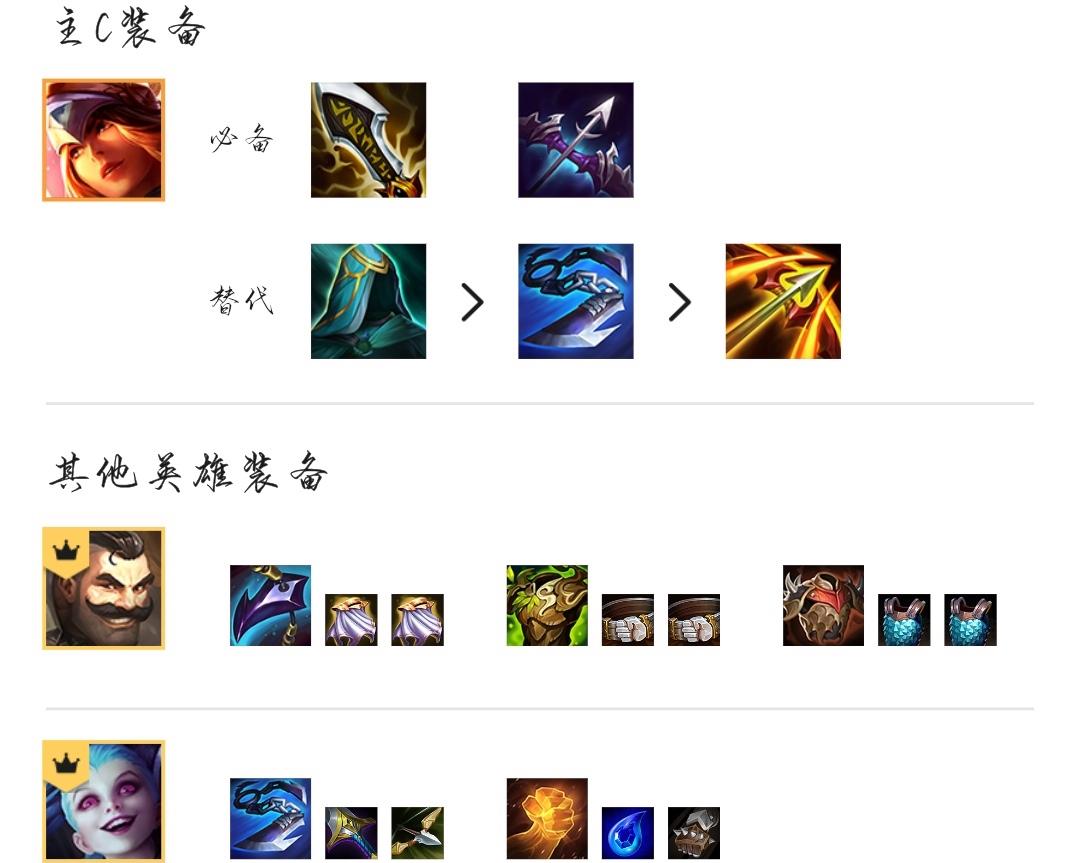 4、阵容的主要输出是希维尔,装备为:无尽之刃和最后的轻语是必备的,第三件装备从水印、巨人杀手、卢安娜的飓风中选一件;布隆的装备为:巨龙之牙、狂徒铠甲、棘刺背心;金克斯的装备为:巨人杀手、正义之手。
