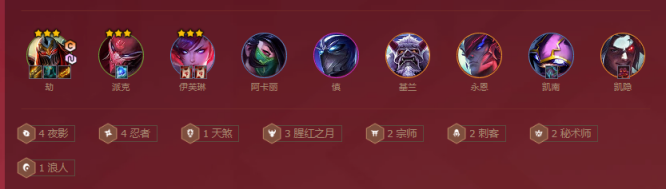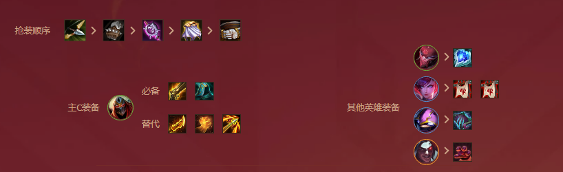 3、装备分析:主C劫,三神装是火炮水银羊刀,火炮加攻击距离和攻速;水银免控,并且可以防宗师;羊刀增加持续输出能力。副C寡妇,基克越多越好,能三星的话也可以给输出装或者肉装。然后还有多余的装备,可以给凯南凑本鬼书;派克,带个冰心;凯隐,输出装捡垃圾。