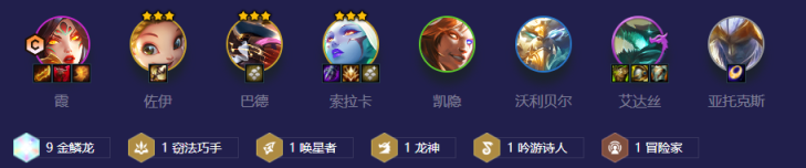 1、金铲铲之战s7赛季 金鳞龙的主流阵容为9金鳞龙五费阵容 下面带来具体的搭配玩法:首先阵容成员由霞 佐伊 巴德 索拉卡 凯隐 沃利贝尔 艾达丝以及亚托克斯组成