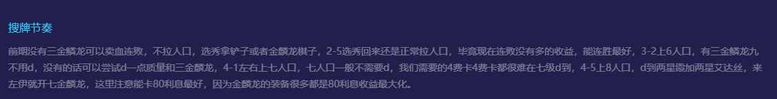 7、对局搜牌节奏分析 3-2上6人口,有三金鳞龙九不用d,没有的话可以尝试d一点质量和三金麟龙,4-1左右上七人口,七人口一般不需要d,4-5上8人口,d到两星霞加两星艾达丝,来佐伊就开七金麟龙